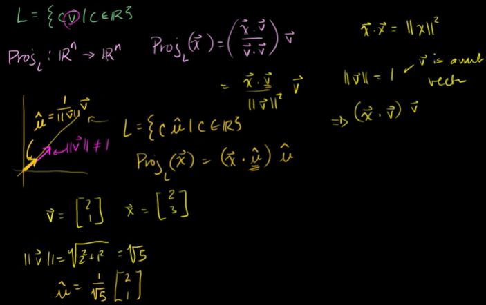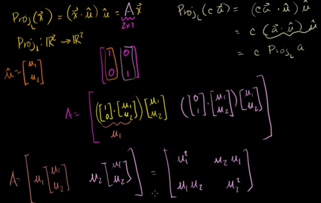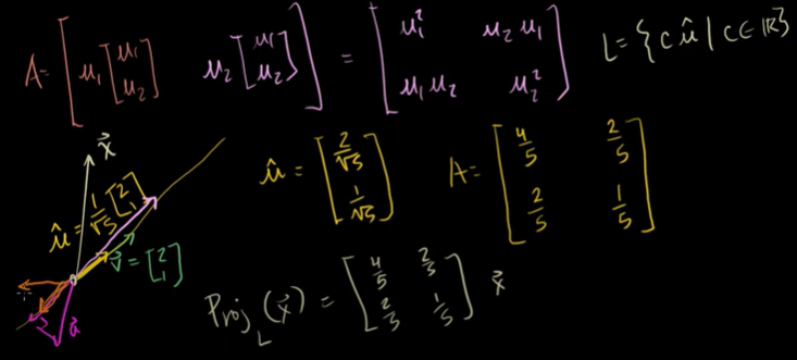 L에 대한 투영을 할 때, L을 단위벡터 u의 임의의 스칼라배라고 해보자. 임의의 벡터 x를 L에 투영하면 행렬을 만들 수 있다. 이 행렬에 x를 곱하면 정사영(Proj(x))이 나오는 것이다.