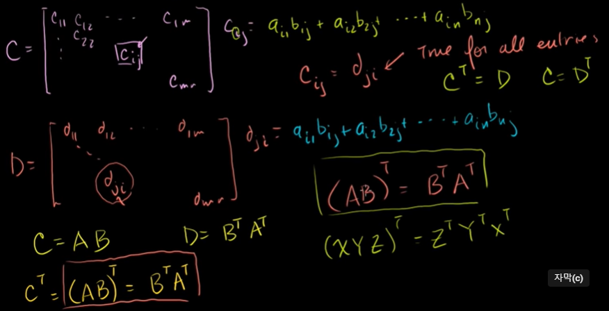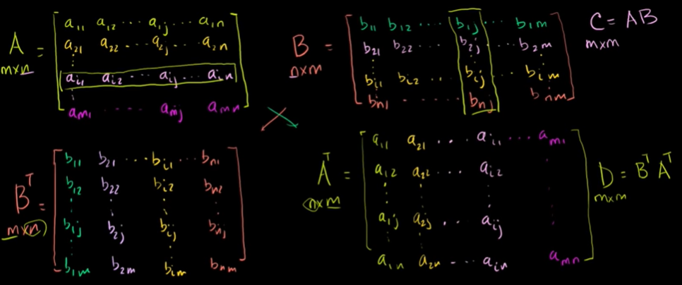 행렬곱 C의 i번째 행, j번째 열에 있는 것 = 행렬곱 D의 j번째 행, i번째 열에 있는 것