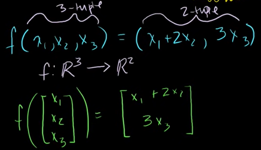 함수 f는 R^3안의 벡터를 R^2안의 벡터로 대응시켜준다.