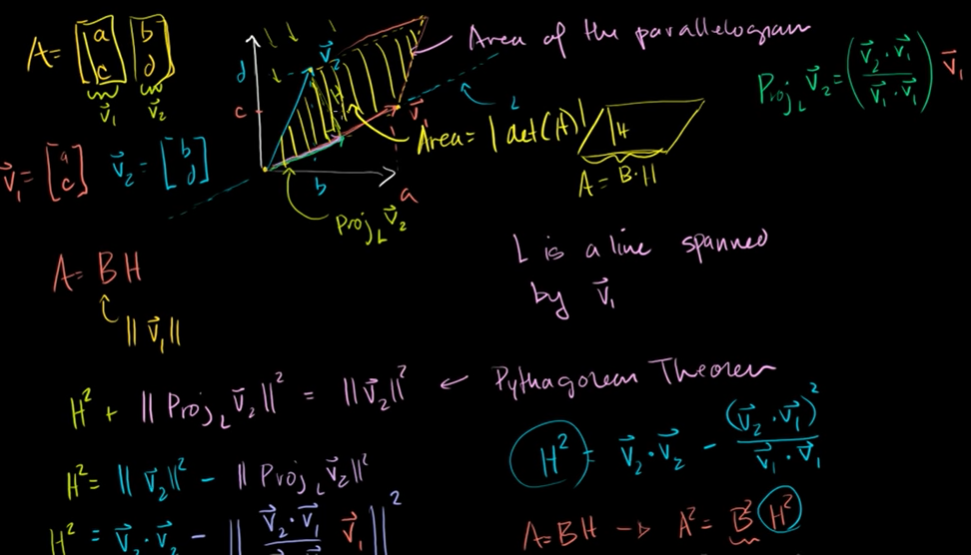 평행사변형의 넓이를 구하려면 v2의 정사영을 구하고 이것을 높이 H와 곱해주어야 한다.