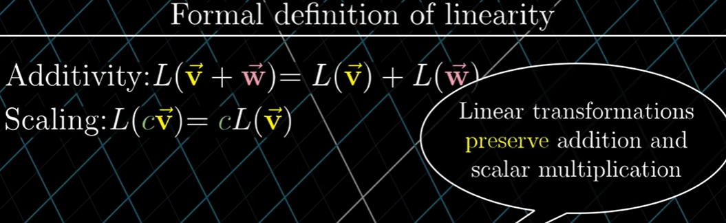 변환이 선형이라면 합과 실수배의 성질을 만족한다. 다른 말로, 선형변환이 합과 실수배를 보존한다.