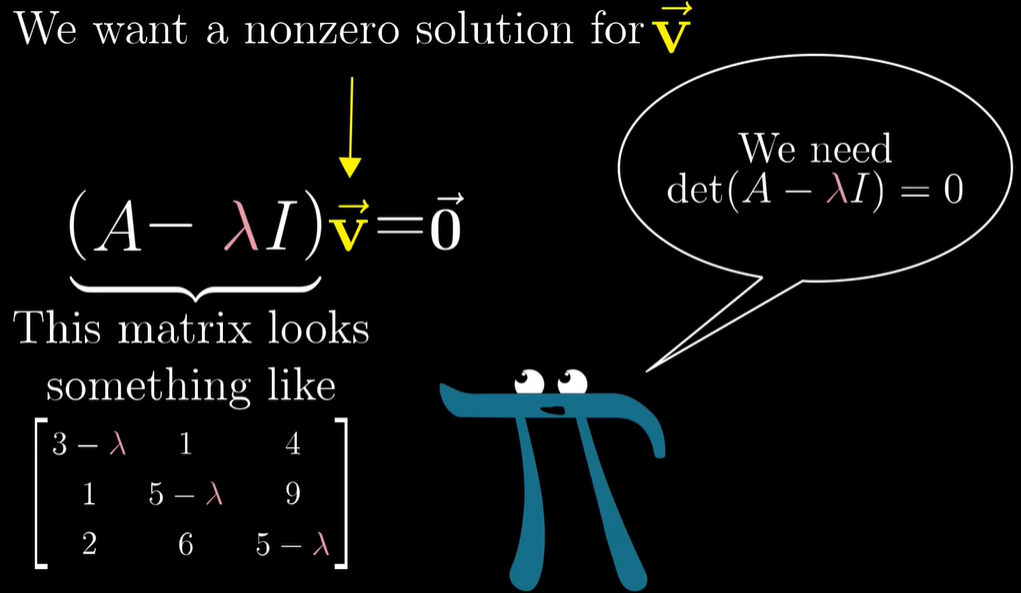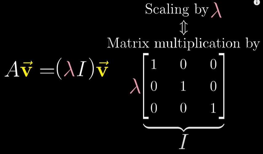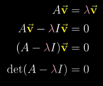 v 와 같다. (Av = λv)이것은 임의의 벡터를 λ 배 하는 행렬벡터곱으로 다시 쓸 수 있다.이러한 행렬의 열은 각 기저 벡터에 일어나는 변화를 나타내는데 단순히 λ배를 하므로 다음과 같아진다.영벡터를 만드는 벡터 v를 찾아야 하는데, 영이 아닌 것 중에서 찾아야 한다. (A - λI) v = 0행렬식이 0이 되는 것을 찾는다.