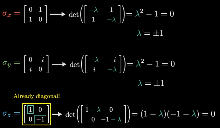 그런데, 사실 quick trick을 쓰지 않아도 정석적인 행렬식이 0이 되는 계산만으로도 고유치를 쉽게 구해낼 수 있다. 세 번째는 이미 대각행렬이므로 해당 대각선에 있는 항목이 고유치이다.