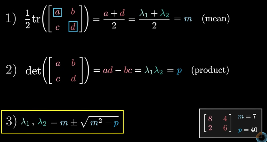 2. 행렬식(ad-bc)은 두 고유치의 곱과 같다.