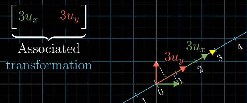 위 예시에서는 i-hat 이 위 행렬로 선형변환되어도 그 스팬에 여전히 존재하고 3배로 증가한다.