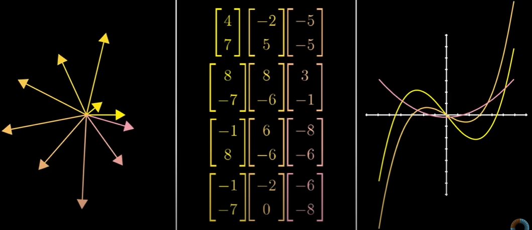 화살표의 집합이든, 숫자의 배열이든, 함수든, 어떻게 정의하든 선형대수학에서 개발한 선형변환, 영공간, 고유벡터, 내적 등의 개념을 사용할 수 있다.