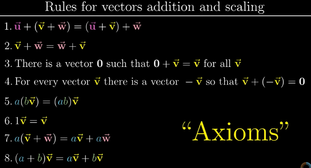 벡터 합과 실수배에서 파생된 규칙을 정립해야 한다. '공리'(Axiom)라고 부른다.