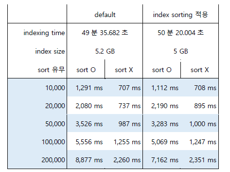 - rdate로 정렬: 실험에서는 Index Sorting을 사용하여 인덱스 생성 시 rdate 필드를 정렬 기준으로 정의하였습니다.