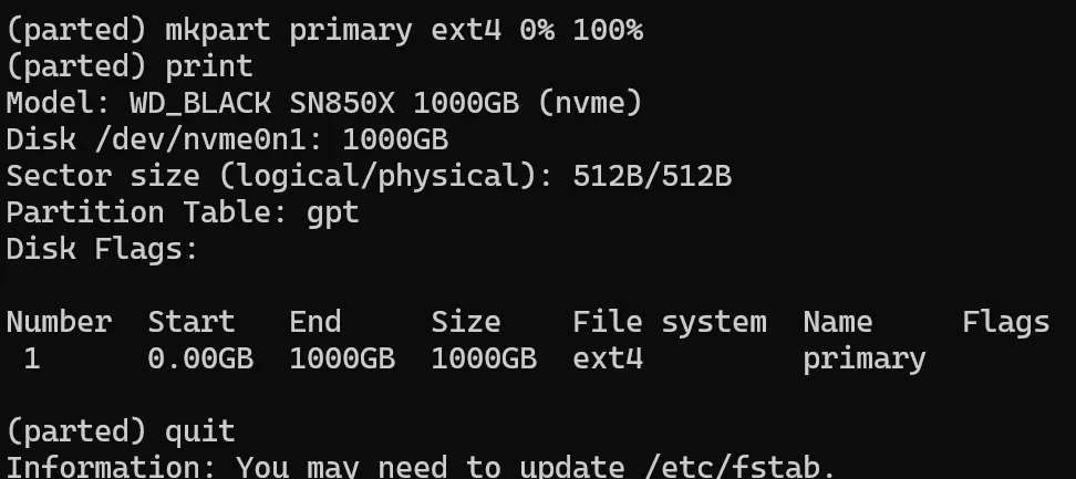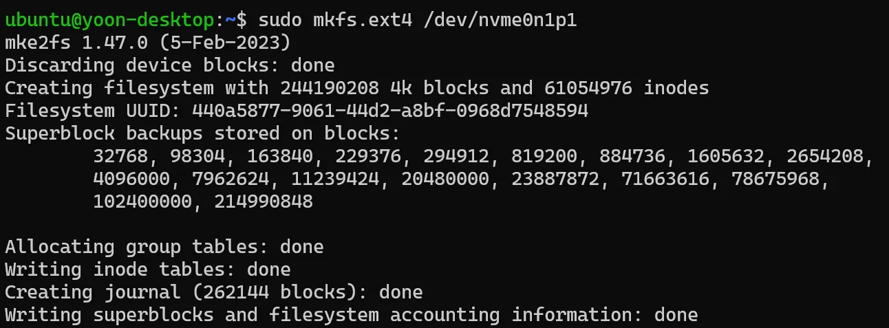 sudo mkfs.ext4 /dev/nvme0n1p1