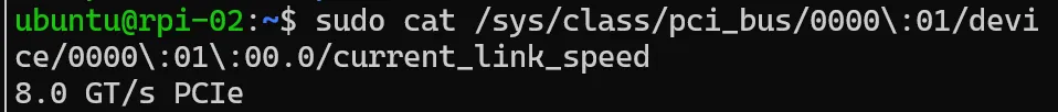 sudo cat /sys/class/pci_bus/0000\\:01/device/0000\\:01\\:00.0/current_link_speed