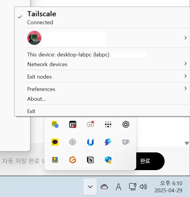 - Windows 시스템 트레이에 Tailscale 아이콘이 나타나며, 여기서 연결 상태를 확인할 수 있습니다